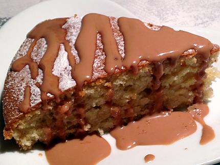 Le gâteau est délicieux servi tiède ou à température ambiante, nappé de sauce Carambar et saupoudré de sucre glace.