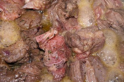 Mettre de l’huile et un morceaux de beuure dans un wok, y faire revenir la viande égouttée, sur toutes les faces. Puis ajouter deux cuillères à soupe de farine et mélanger. Verser la marinade passée sur la viande et y mettre le bouquet garni, l’étamine, le fond de veau. Faire chauffer, puis réduire le feu.