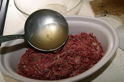 Une fois froide, bien effilocher la viande, la tasser dans une terrine y mettre dessus deux louches de bouillon de cuisson (plus ou moins selon la quantité) au dessus couvrir et enfourné dans un four préchauffé à 170°C pendant 1 h à 1 h30 (selon la quantité de la viande).