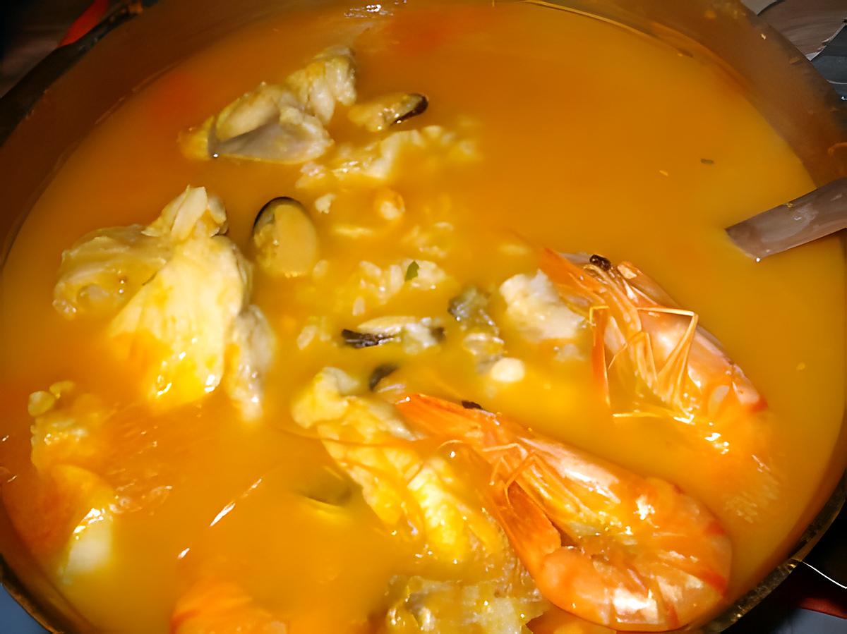Étape 3Ajouter le riz, baisser le feu et laisser cuire à couvert pendant 8 minutes environ. Ajouter la lotte, les moules et les crevettes, continuer la cuisson 5 minutes, servir immédiatement dans un récipient en terre cuite.