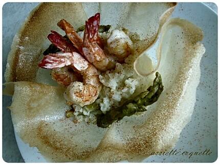 Étape 4Dresser en déposant un peu de risotto dans une feuille de brick, ajouter 4 gambas par personne, saupoudrer de paprika pour la couleur et servir.