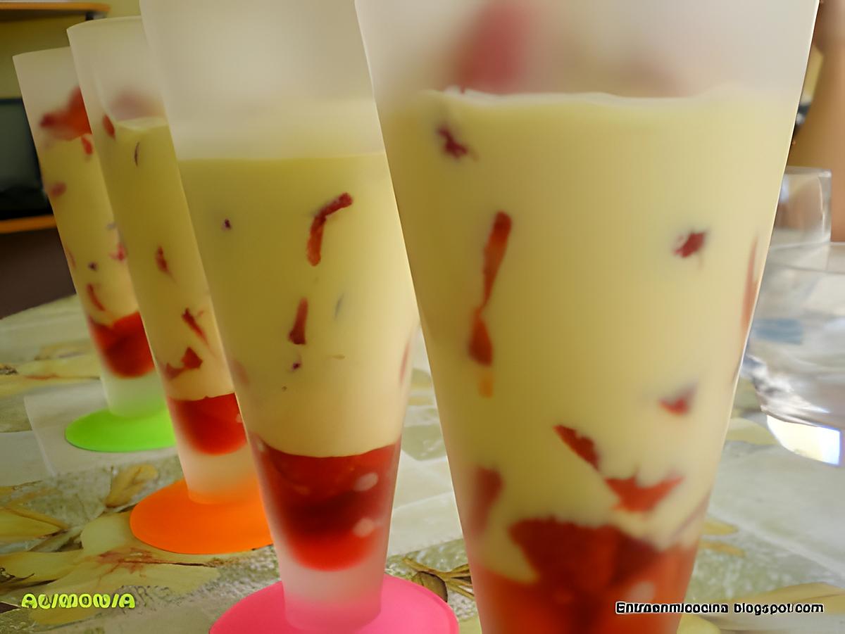 Dans des coupes ou verrines, mettre un peu de fraises, de la creme, un peu de fraises.. Et terminer si vous voulez par des amandes éffilées... SERVIR... ET... BON APPETIT.
