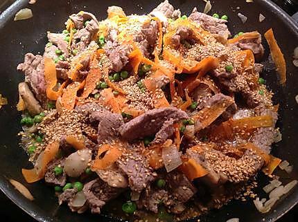 Dans un grand wok, faites fondre l'oignon et l'ail dans de l'huile de sésame sans les faire colorer. Augmentez le feu, puis ajoutez les lamelles de bœuf. Faites les revenir à feu vif très rapidement, puis ajoutez les champignons et les carottes, ensuite les petits pois.