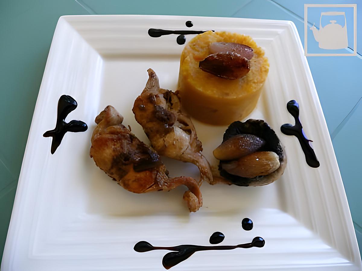 Sur l'assiette de service remplir des cercles de purée, tassez bien, puis dressez les râbles deux par assiette, les champignons et les échalottes confites, ôter les cercles et servez chaud.
