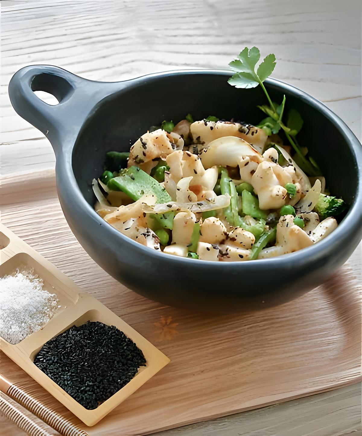 Ajouter la sauce, les légumes préalablement cuits à la vapeur et poursuivre la cuisson quelques minutes - la sauce doit légèrement épaissir et enrober les calamars et les légumes – en fin de cuisson, saupoudrer généreusement de poivre concassé, saler au goût.