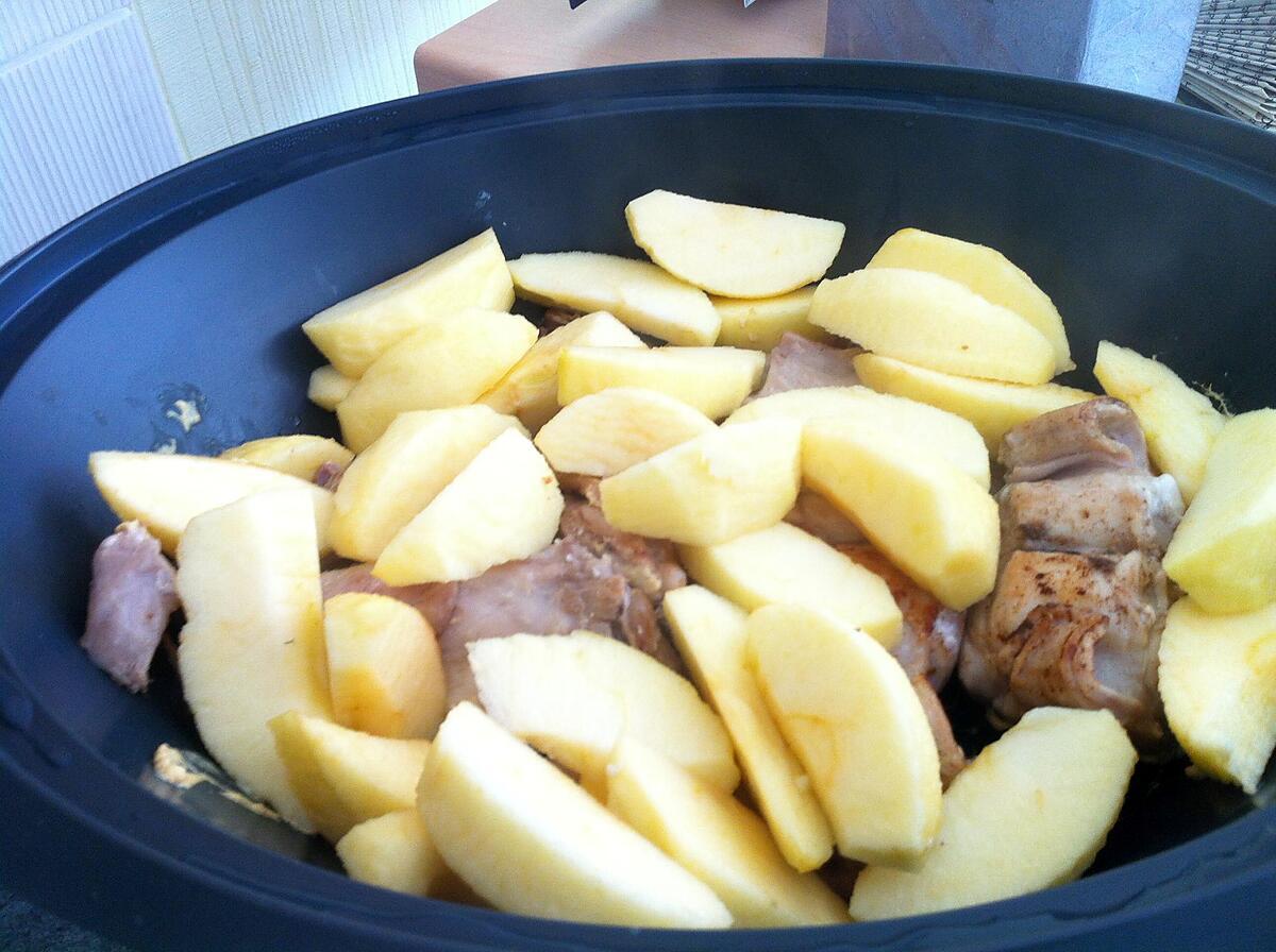 Eplucher et couper les pommes en gros quatiers et les mettre sur le lapin au bout de 20 minutes de cuisson.