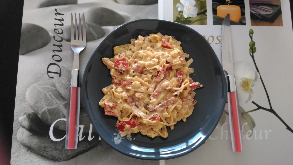 120 G de nouilles1/2 Camembert20 Cl de crème1 Poivron rougeDés de jambonPoivreSelPimentHerbe