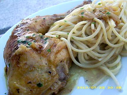 Mots-clés: ail, bouillon de volaille, crème fraiche, herbes de provence, huile d'olive, laurier, mélange de 5 baies, oignon, paprika, persil, poulet, spaghettis