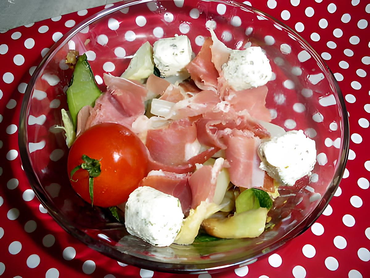 120g de dés de chévres, 1 boite d asperge en bocal, 1 bocal d artichaux marinés,3 petites courgettes, 4 tranches de jambon de parme,4 tomates cerise (vous pouvez remplacer les dés de chèvres, par les petits boursins special salades)