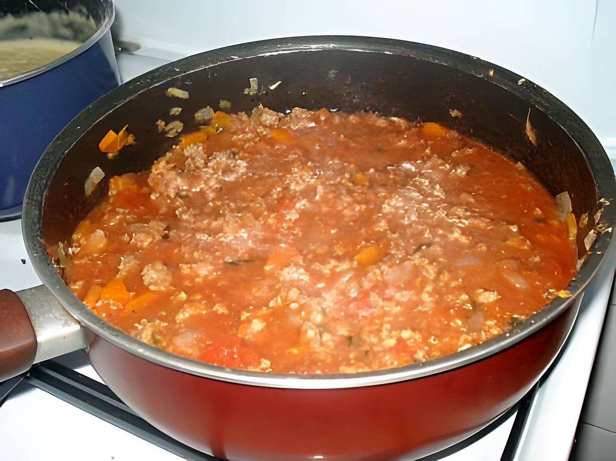600G de boeuf haché 1 Gros oignon 1 Carotte Huile de noix où olive Basilic 1 Boîte de tomate pelée 1 Boîte de concentré de tomate.