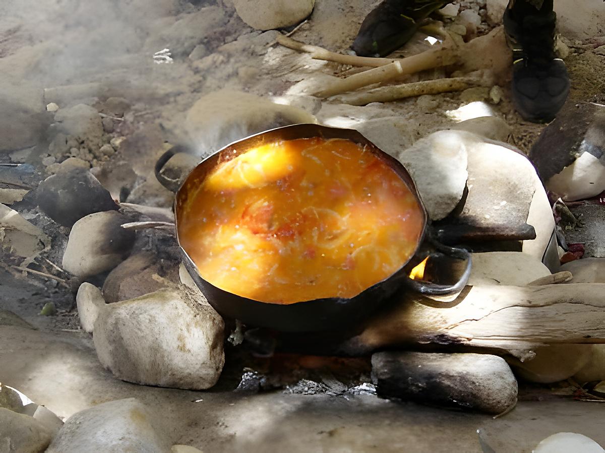 Je ne vous dis qu'une chose c'était très bon, un plat usé, des branches, une gamelle, une cuillère à soupe et les fesses par terre.