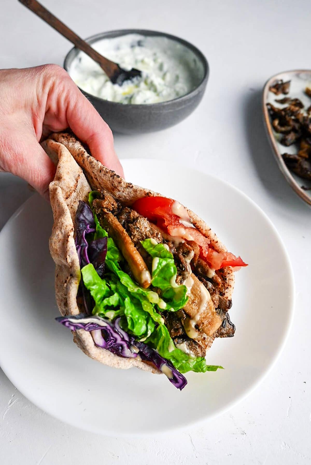 • Après avoir grillé les champignons, les trancher finement. Chauffer le pain pita, puis garnir de sauce tzatziki (ou sauce blanche), de tomate, de laitue, de chou rouge et de champignons. Déguster !