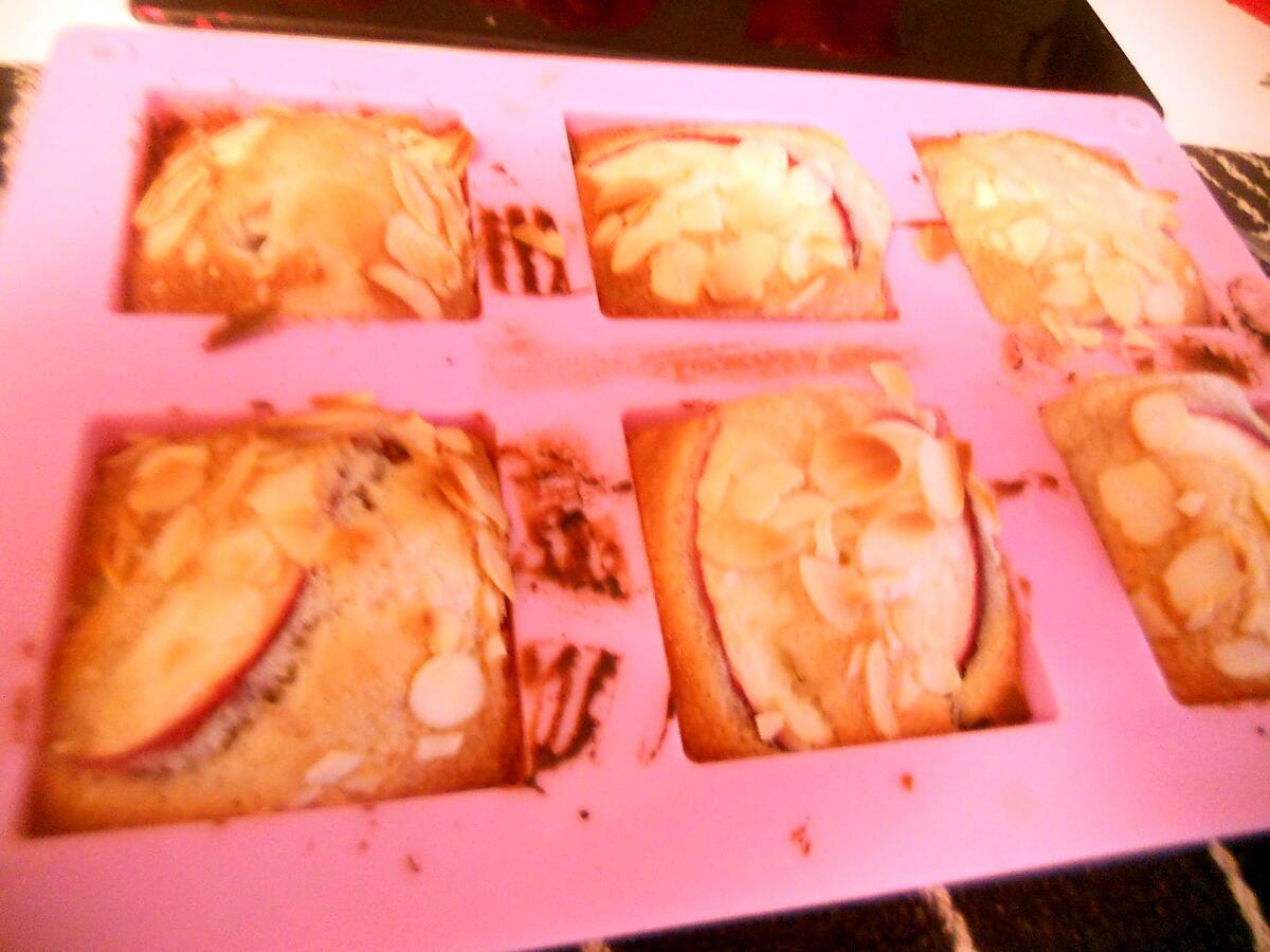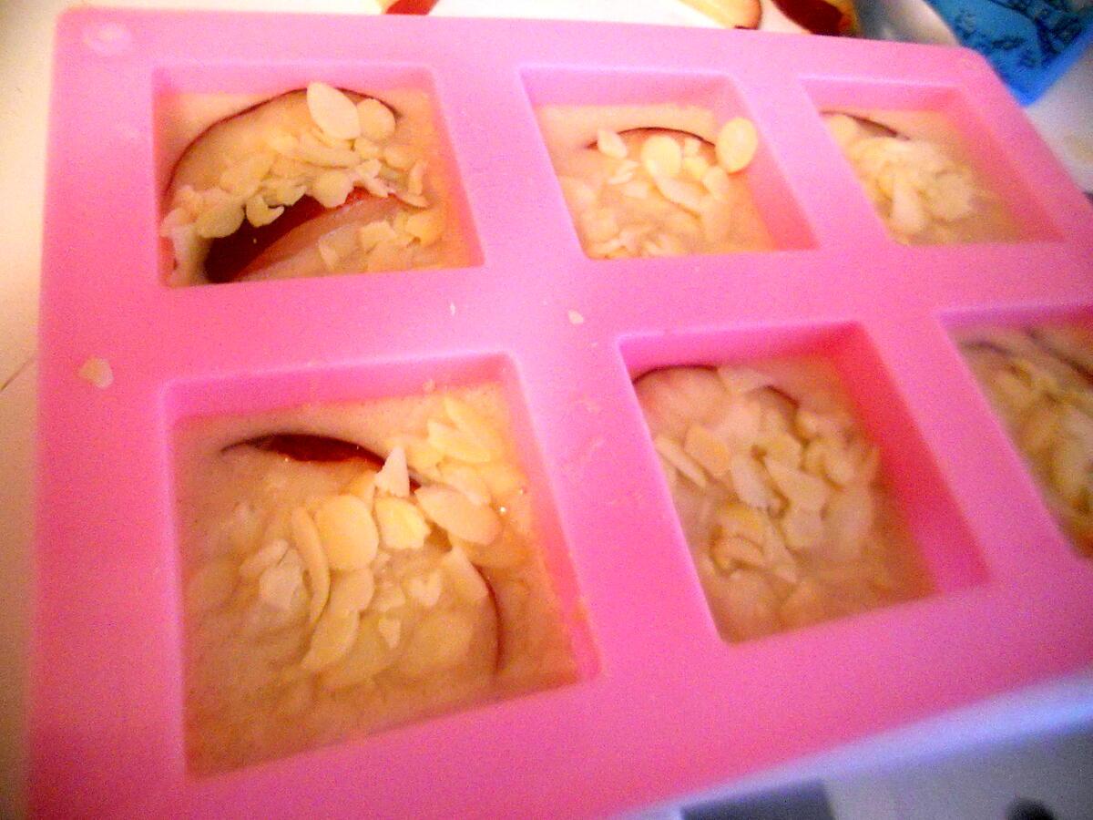 Mélanger tous les ingrédients farine, sucre, lait, levure, canelle, ravec les morceaux de fruits et en gardé quelques uns pour mettre dessus, les déposé dans des moules en silicone, par dessus on met les morceaux de fruits qu'on a gardé, et les amande éffilés.