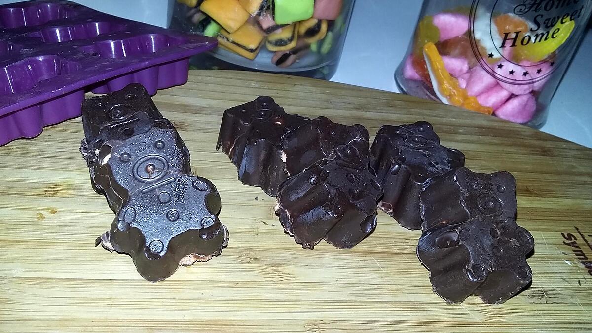 Mélanger et remplir les oursons avec. Remettre au frais pour que sa durcissent. Faite fondre le reste du chocolat et fermer les oursons par dessus le marshmallow.