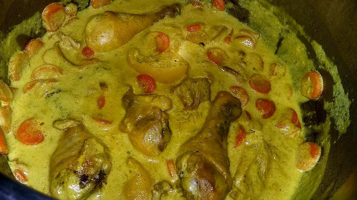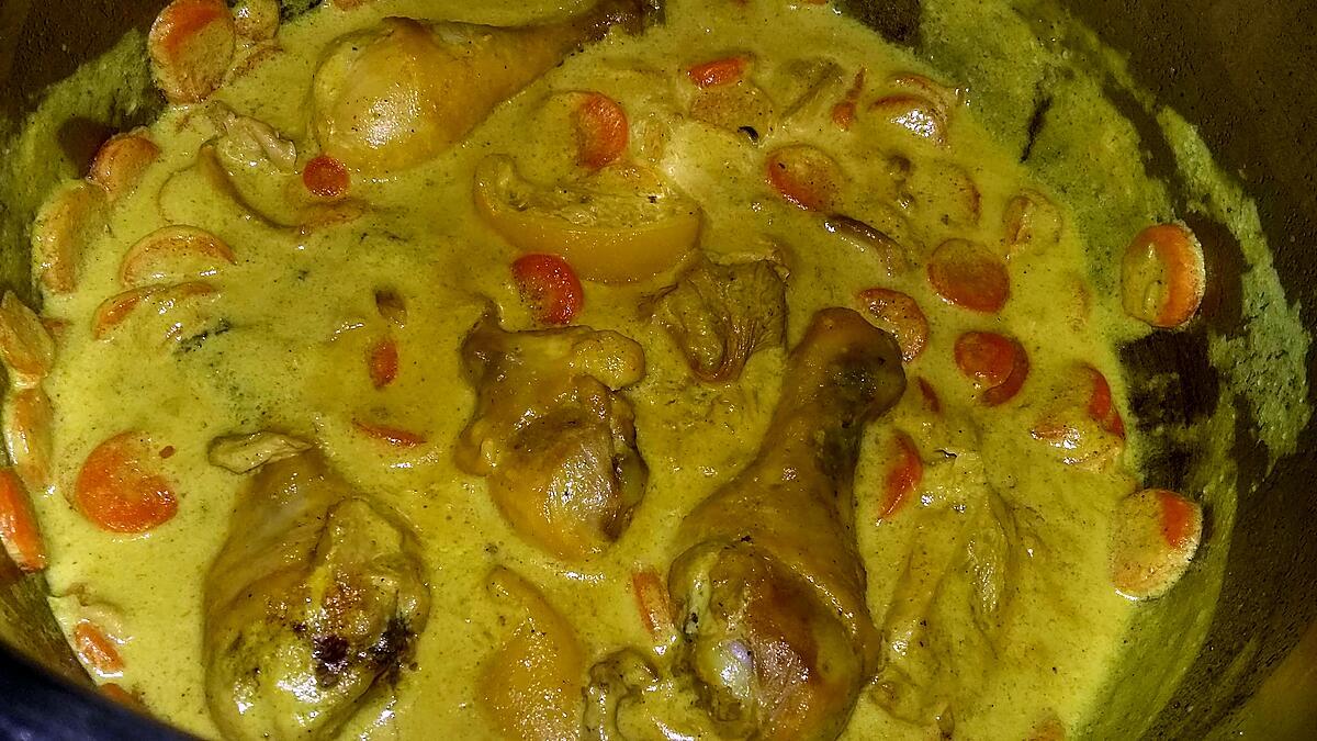 des pilons de poulet20 cl de lait de coco2 cas de curry1 échalote émincé150 gr de carottes surgelées2 citrons confit au sel maison150 gr de champignons de Paris surgelés1 cube de volaille