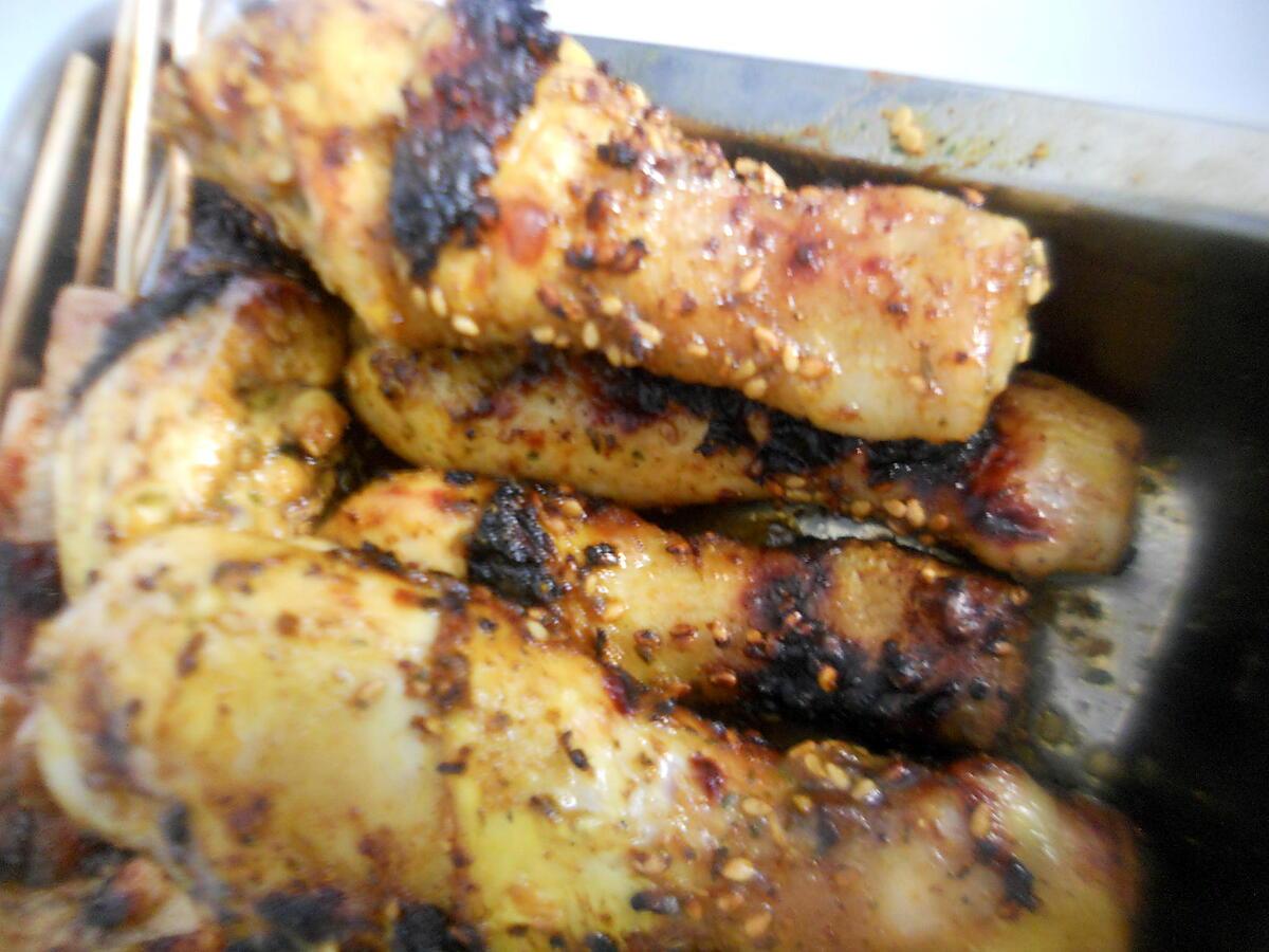 6 Pilons de poulet1 Jus de citron1 Càs de moutarde a l'ancienne1 Cas de curry1 Cas de miel bombé1 Cac de persillade1 Bouchon de sauce soja1 Cas d'huile1 Cas de graines de sésame grillé