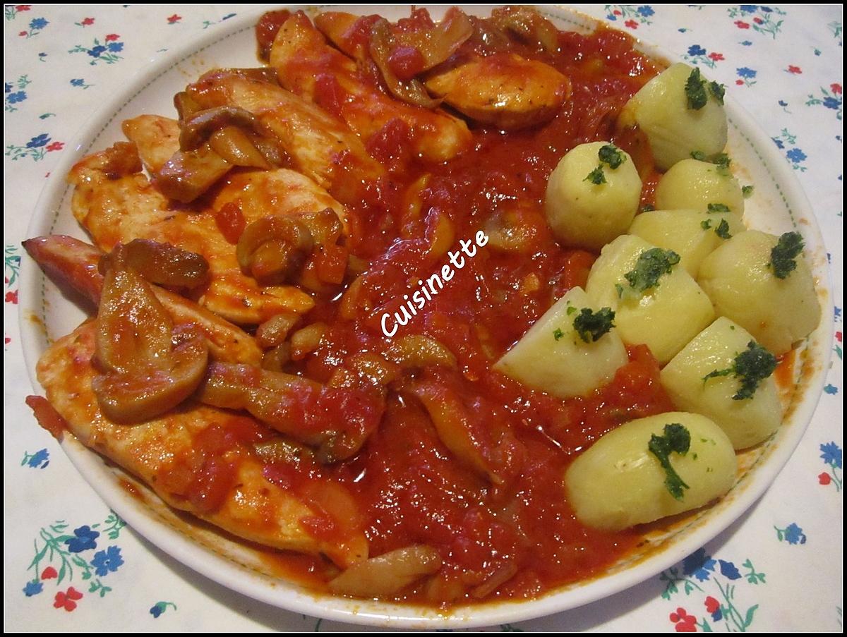 Aiguillettes de poulet aux champignons,sauce Napolitaine.