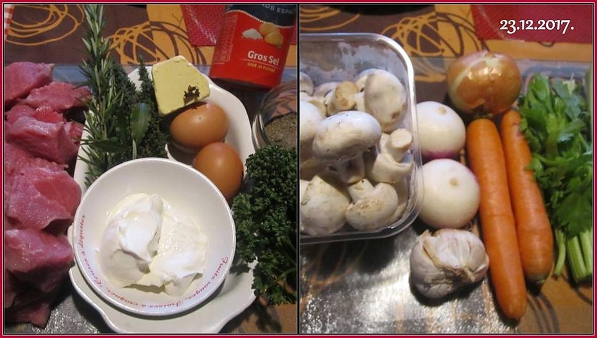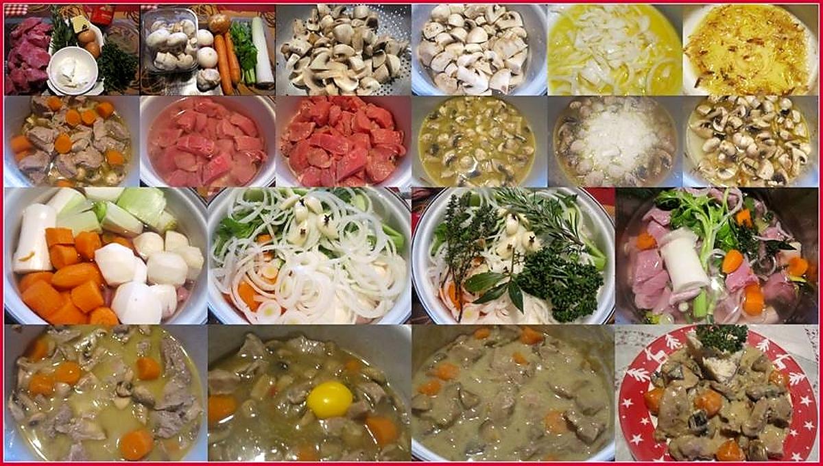 Mots-clés: ail, aromates., beurre doux, bouquet garni, carottes, céleri, champignons, crème fraiche, marmite de légumes, navets, œufs, oignon, poireau, poivre, sauté de veau, sel