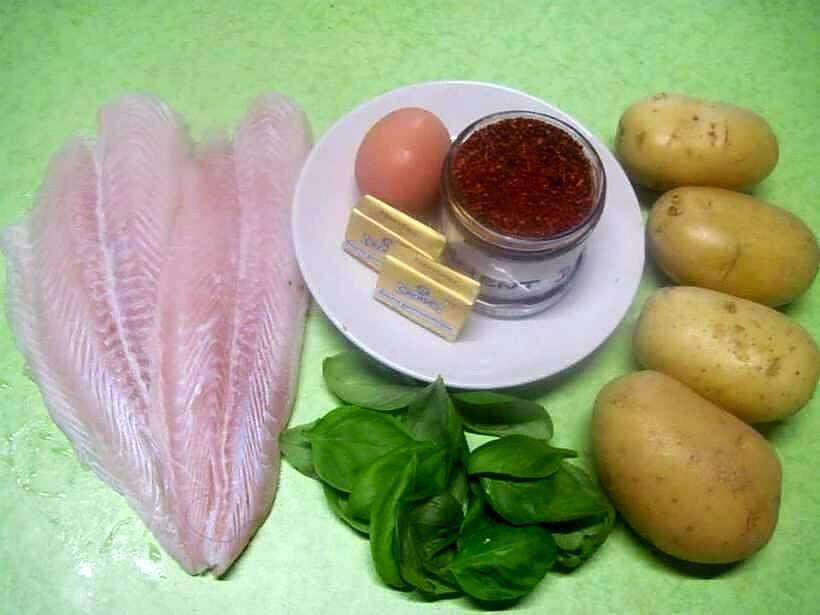 Mots-clés: poisson Pangas. pommes de terre.beurre.feuilles de basilic.œuf .piment d'Espelette.farine. crème fraiche liquide.sel fin.sel fin