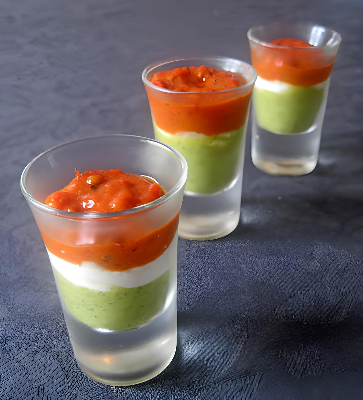 Dans des verrines, verser une couche de purée de courgettes au basilic, une couche de mousse de fromage de chèvre frais et finir avec une couche de purée de tomates confites à l'huile d'olive et à l'origan.