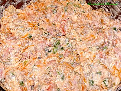 1 lb de crevettes de Matane ( Nordique c'est la même chose )2 fromage (8onces) à la crème ramolli philadelphya2 tasses de fromage cheddar fort jaune râpé1 bte de thon dans l'eau égoutté1/2 piment vert haché fin1/2 piment rouge haché fin ( pas mit )1/2 petit oignon haché finement2 cuil à thé jus citron2 cuil à thé sauce worcestershire1 pincée de poivre de cayennesel - poivre au goût2 tasses de noix de grenoble hachée finement