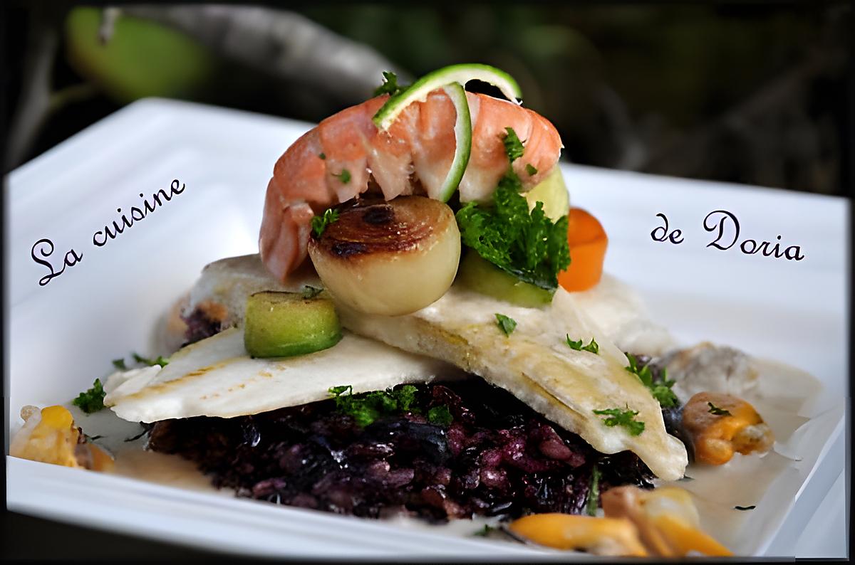Filets de carrelet aux fruits de mer sur son lit de riz pervenche du Laos