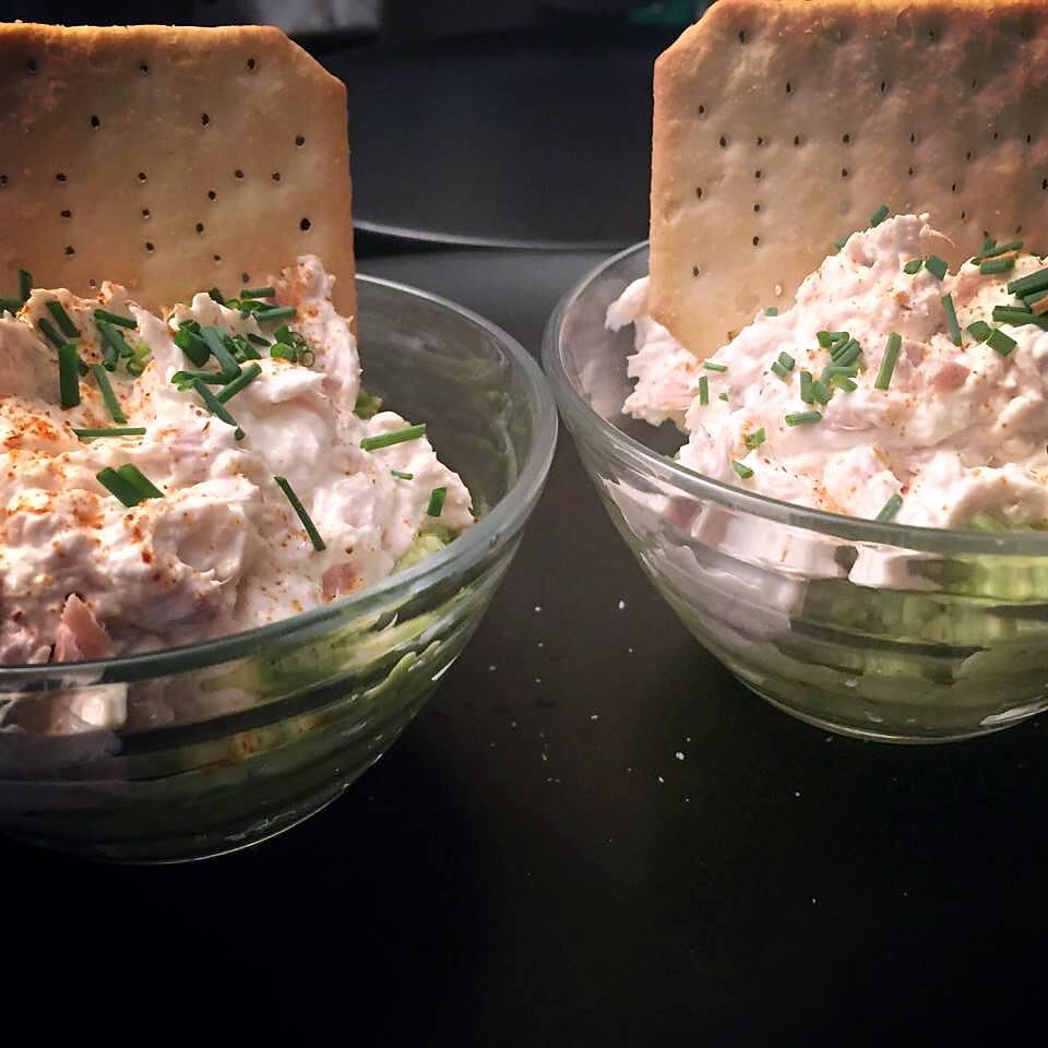 Dans une verrine, disposez la purée d'avocat puis le mélange thon/fromage.