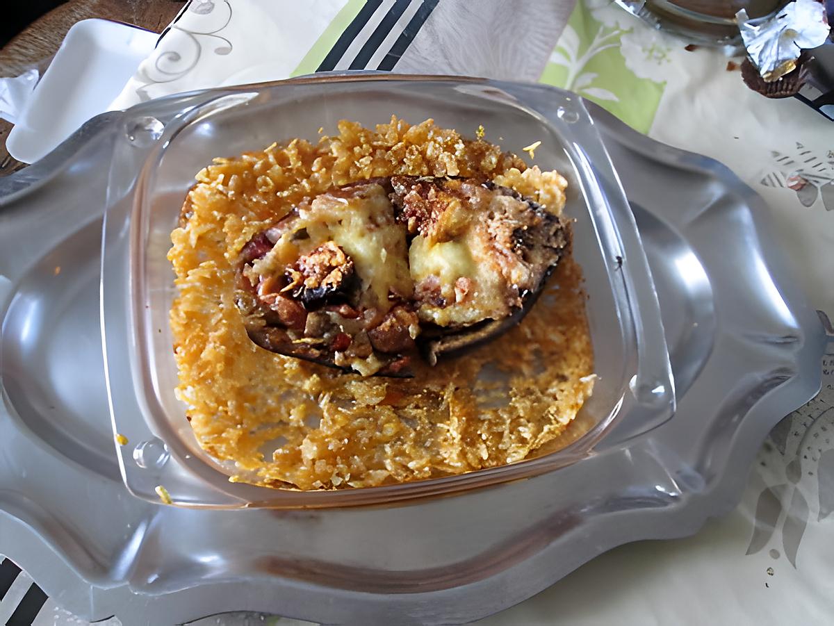 Remplir les augergines mettre dessus ratatouille et chorizo ,,, un peu de gruyére,, laisser cuire a feu 140 pour moi 20 mn environ.