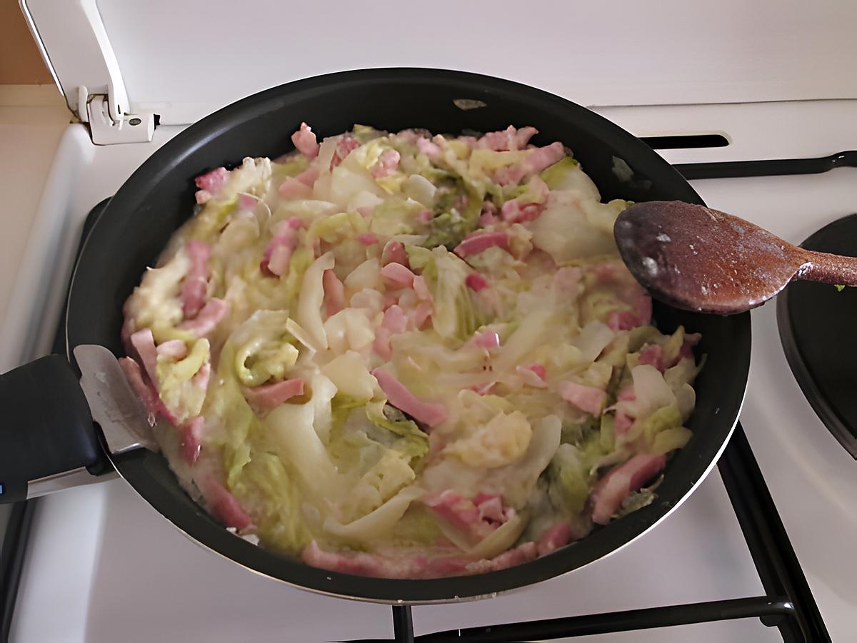 Un chou chinoisDes lardonsCréme fraicheCube de volaille Oseille Sel PoivreÉchalottes