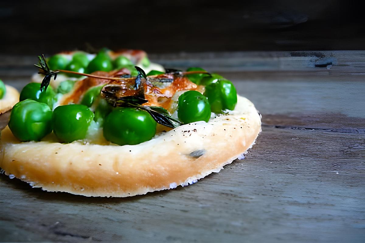 Répartir les petits pois dessus. Les parsemer de menus dés de Cambozola