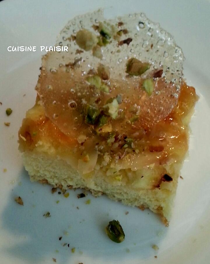Cake nature, pour aller avec ma soupe de fruits, pommes caramélisées et petit disque transparent en sucre