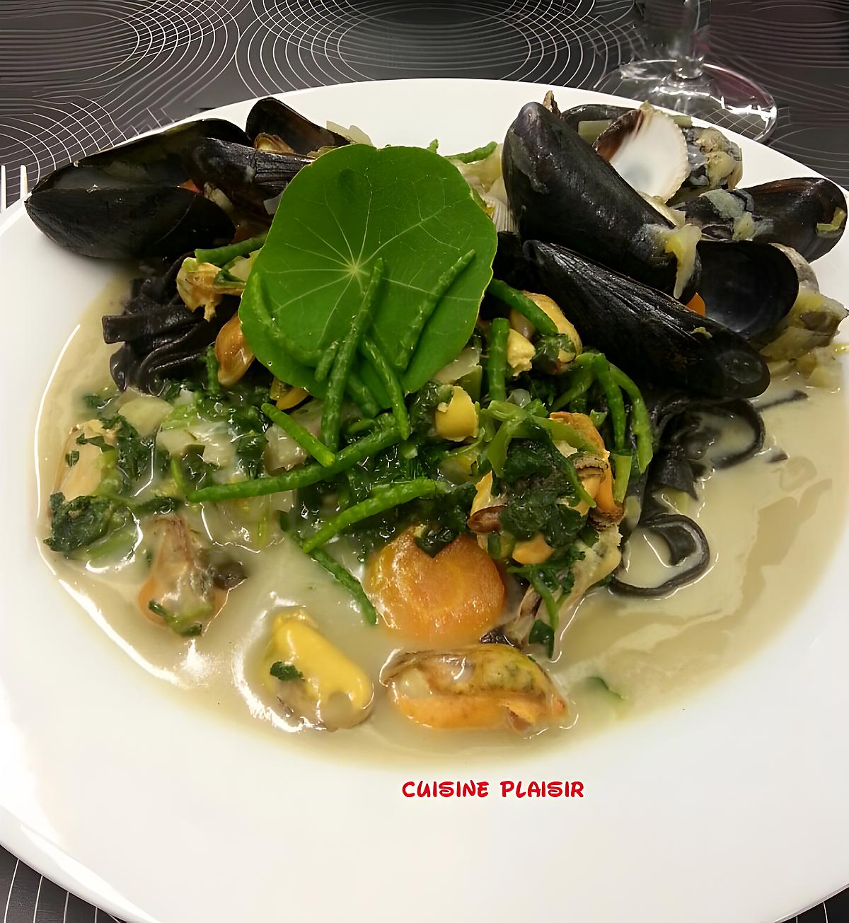 De retour de la mer..... Moules, coques, aux pâtes noires, cresson fontaine et salicorne