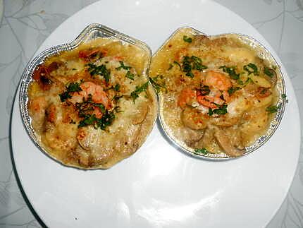 Moules. Fruits de mer (calamars,crevettes,vongole)1/2 Boite de champignons quenelles de brochet (2)Farine beurre Jus des moules et des champignons pour la bechamelle Sel et poivre. Un peu de chapelure. Et du gruyere rape. 4 Petites pommes de terre cuites vapeur4 Coquilles