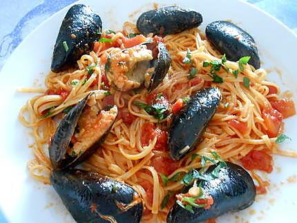 Farcir les moules avec cette farce et les ficeler. Faire la sauce : dans une poele mettre l'huile d'olive, l'ail taillé finement, le peperoncino et les tomates concassées laisser cuire une dizaine de minutes. Puis ajouter les moules et laisser encore mijoter 10 minutes. Pendant ce temps faire cuire les pates les égoutter et les ajouter dans la poele remuez délicatement parsemez d'un peu de persil haché et servir. On peut enlever la ficelle avant de servir.
