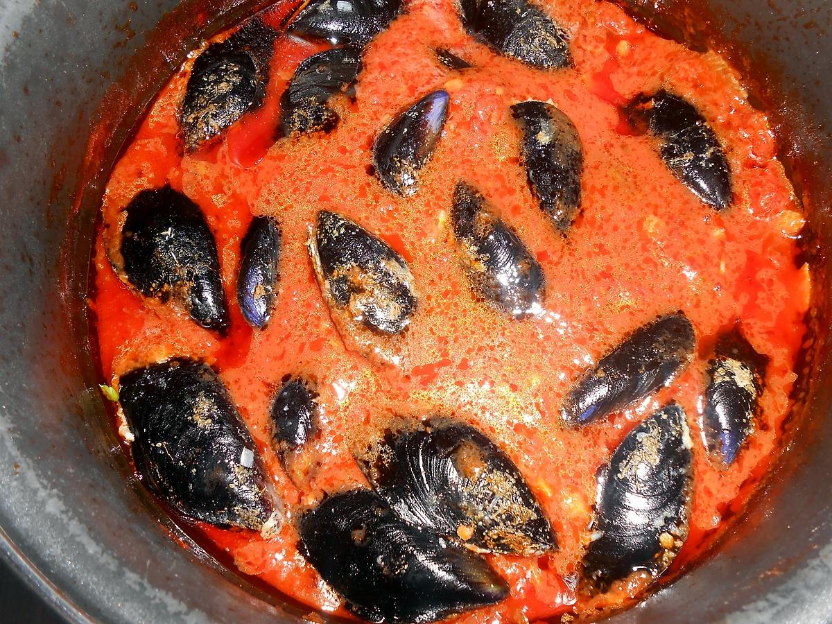 Faire une sauce tomate avec une 1/2 boite de concassee de tomates de l'ail du basilic et laissez mijoter 1/2 heure. Quand la sauce est prete y mettre les moules et faire mijoter 20 minutes.