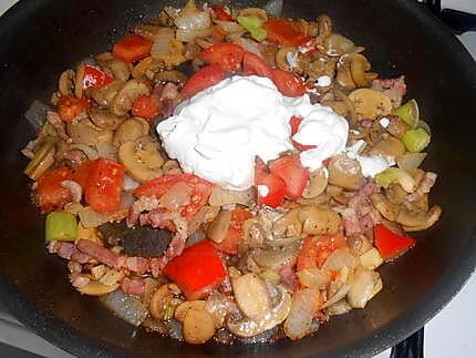 DANS UNE POELE METTRE UN PEU D'HUILE D'OLIVE ET FAIRE DORER LA VIANDE ET L'OIGNON TAILLE EN LAMELLES FINES. AJOUTEZ LA TOMATE COUPEE EN MORCEAUX ET LES CHAMPIGNONS EGOUTTES (garder le jus) ET LES LARDONS LAISSEZ MIJOTER 10 MINUTES PUIS AJOUTEZ LA CREME FRAICHE SEL POIVRE ET LAISSEZ ENCORE MIJOTER 10 MINUTES.