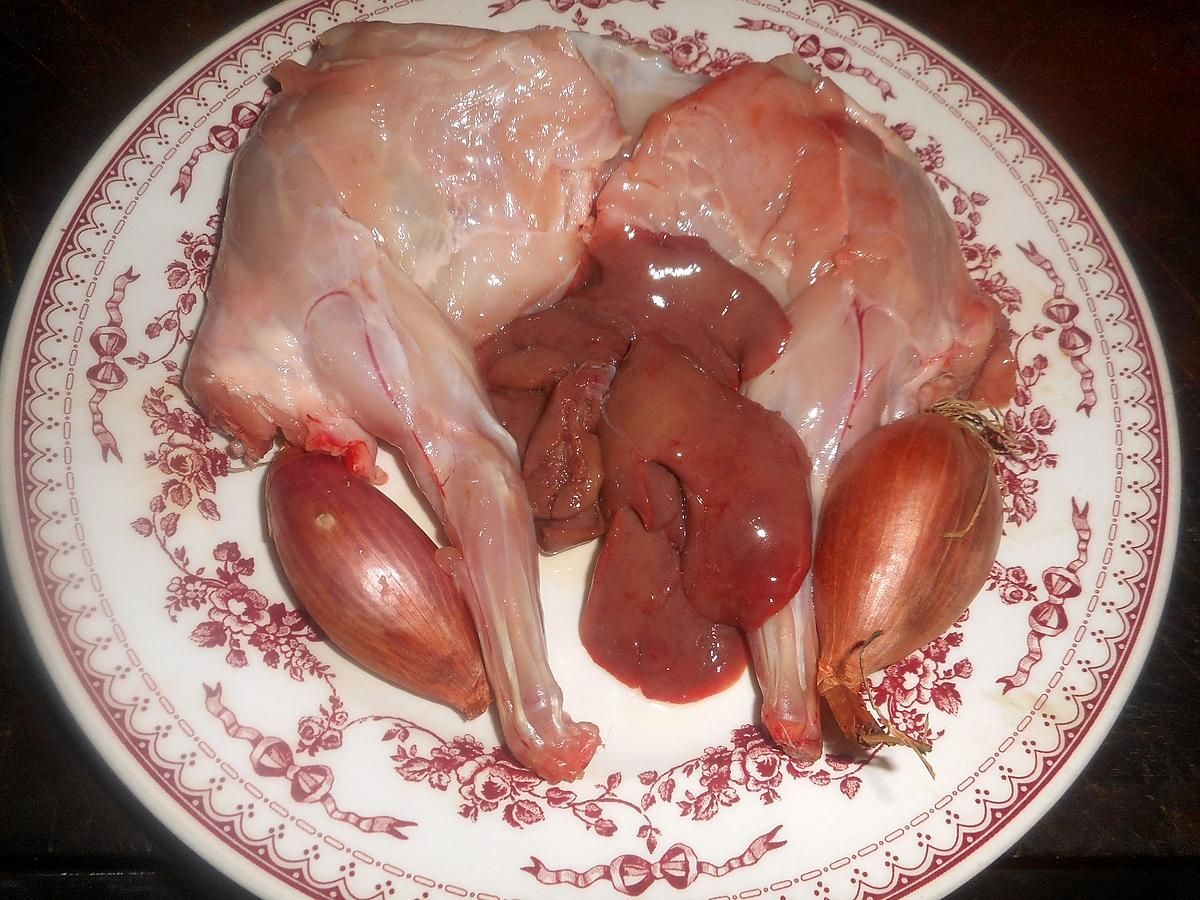 Un avant de lapin un foie de lapin 2 échalotes 450 gr de mélange forestier(perso congelé) herbes de provence piment d espelette une cas de ciboulette ciseléehuile d olive10 cl de jus de veau selpoivre