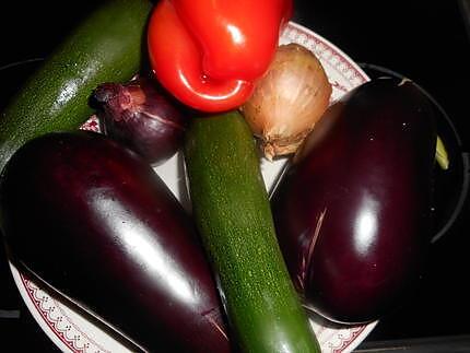 Un oignon blancun oignon rouge2 aubergines 2 courgettes un poivron rouge 3 tomates 2 gousses d ailthymlaurieroriganpaprikaselpiment de Cayennehuile d olive