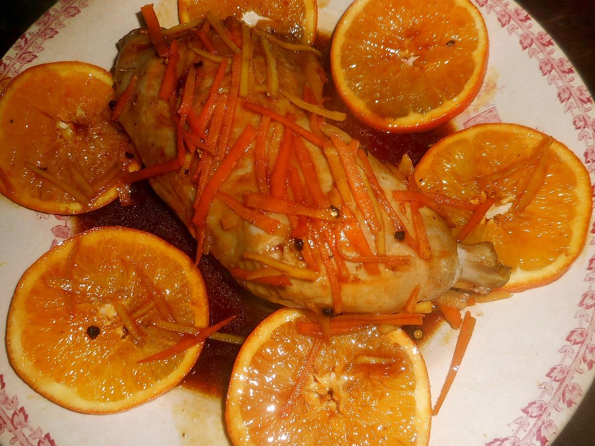 Four a 200 degrés. Epluchez et émicez les oignons. Zestez le citron et une orange. Coupez les deux autre en 10 belles rondelles. Pressez les oranges et le citron, reservez le jus. Dans un plat a four faire un lit d oignon, disposez le thym, dessus la cuisse de dinde, une belle noix de beurre, une cas d huile d olive, sel, poivre. recette Cuisse de dinde à l orange Enfournez pour faire dorer, tournez plusieurs fois. Mouillez avec le jus des agrumes, le cognac, le fond de veau. Faire cuire 30 minutes environ, en surveillant. Disposez les rondelles d orange 5 minutes sur la cuisse de dinde. Pendant la cuisson de la cuisse de dinde, faire cuire les zstes d orange et citron dans une petite casserole avec une cas de sucre et 10 cl d eau. recette Cuisse de dinde à l orange Dans une autre casserole faire un caramel avec le reste de sucre, ajoutez le vinaigre, retirez du feu. Egouettez les zestes d agrumes ; Sortir le plat du four. Disposez sur un plat de service, les rondelles d orange, dessus la cuisse de dinde. Filtrez le jus de cuisson dans une casserole, incorporez le cointreau, les zestes d orange et citron et la gastrique (le caramel au vinaigre). Réchauffe la sauce sur feu doux. Vérifiez l aissonnement. recette Cuisse de dinde à l orange Nappez de sauce la cuisse de dinde. Servez avec des pmmes duchesse ou dauphines.
