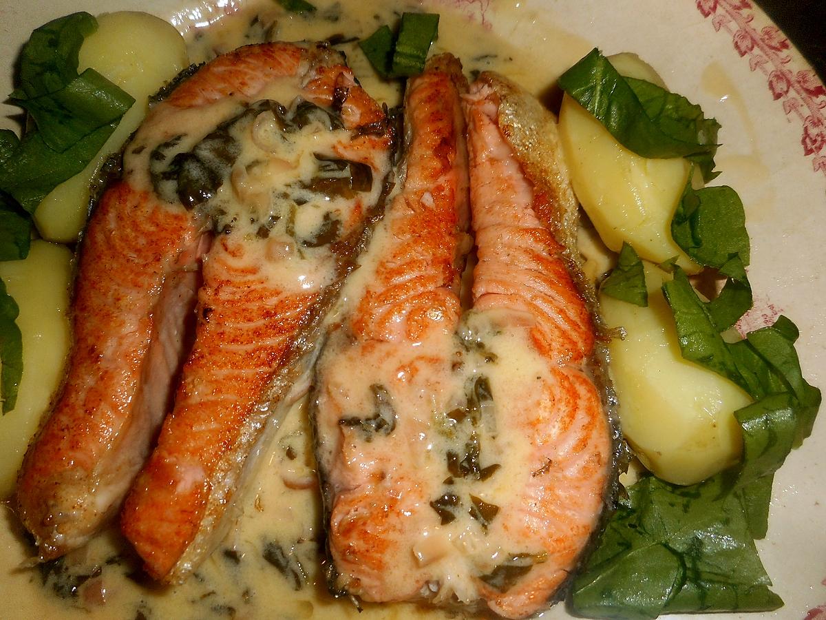 2 Darnes de saumon de 180 gr environUn bouquet d oseille3 Échalotes10 L de vin blanc3 Cas dee creme fraiche200 Gr de beurreSelPoivre blancHuile