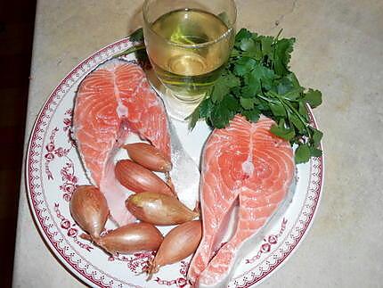 2 Darnes de saumon de 180gr environ5 Échalotes30Gr de beuure15Cl de creme liquide8Cl de vin blanc(muscadet)È brins de persilSelPoivre