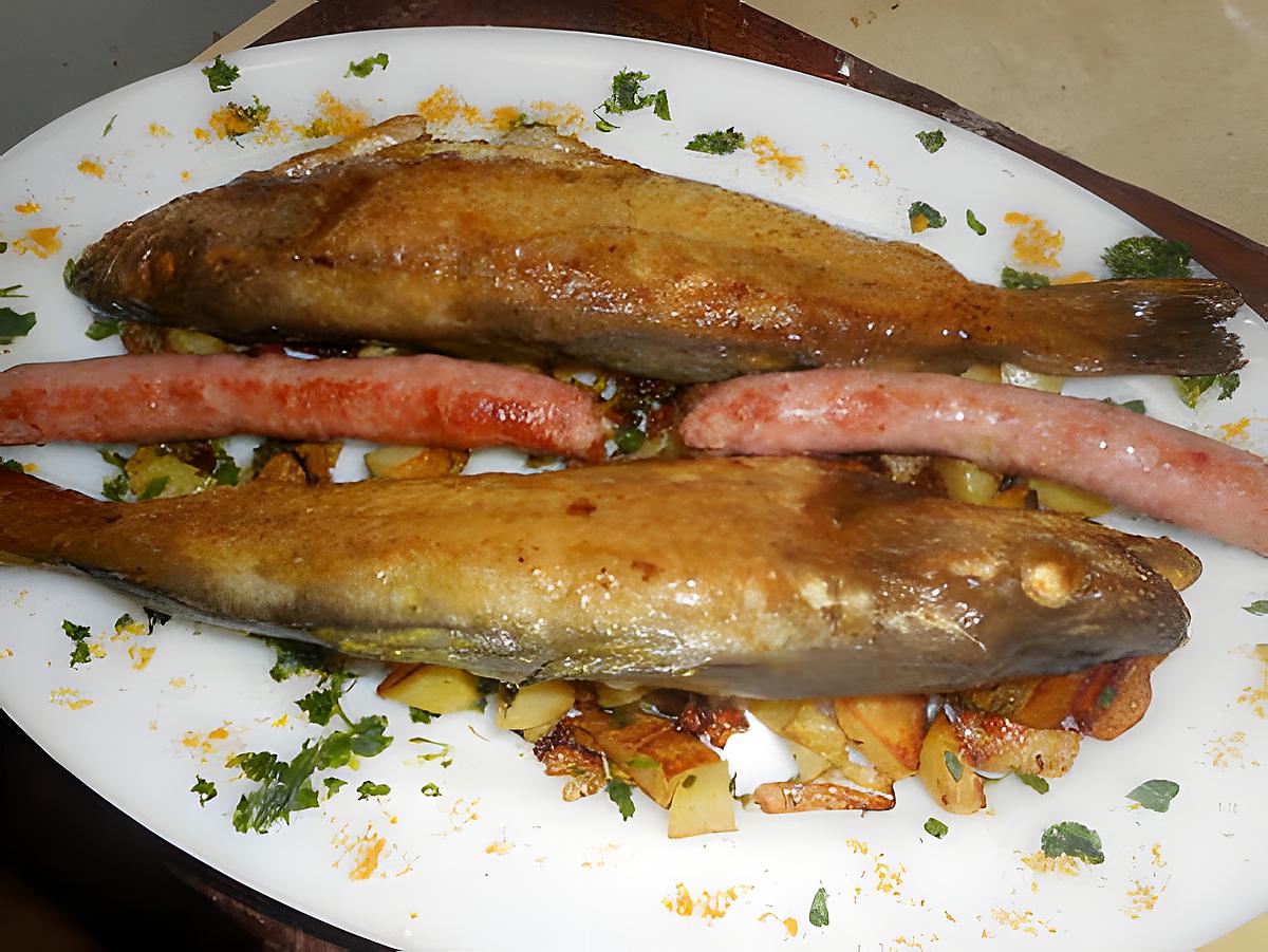 2 Lieux jaunes de 260 gr chacun environ 2 Chipolata 6 Petites pommes de terre Un oignon Une cs de persil Farine Une cac de poudre de curry SaindouxBeurreSelPoivre