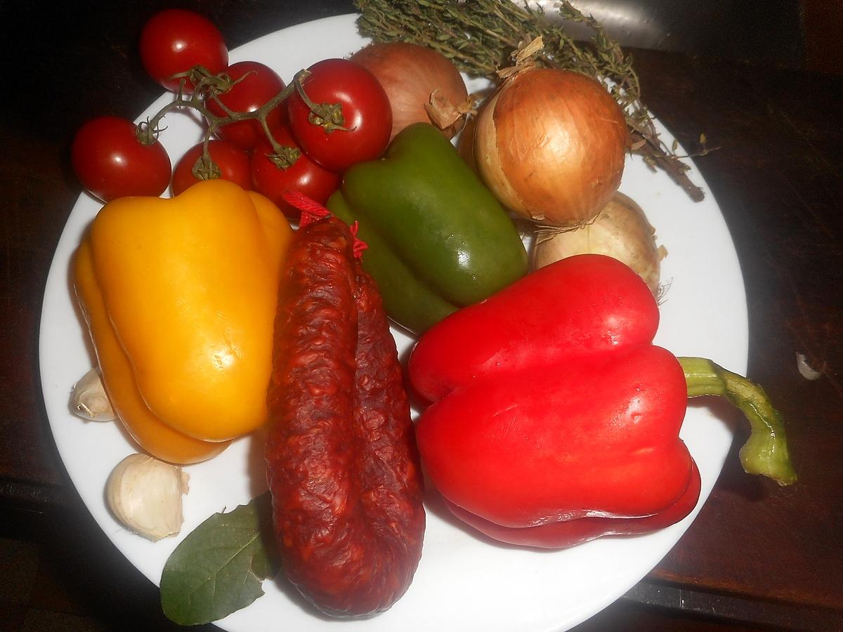 4 Oignons3 PoivronsUn vertUn rougeUn jaune2 Gousses d ail2 Branches de thymUne feuille de laurierUne boite de pulpe de tomateUn chorizo basque6 ŒufsHile d oliveSelPiment d espeletteUne cas de persil haché6 Petites tomates grappes