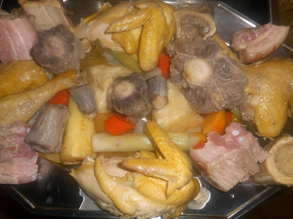 Un poulet fermier de 1 kg 4 environ une queue de bœuf coupée en morceaux un morceau de lard demi-sel de 750 gr 4 blanc de poireaux 2 carottes 2 panais 2 navets2 navets boule d orun quart de boule de céleri 4 pommes de terre 4 os a moelle un oignonun bouquet garniune étamine nouée avec 5 clous de girofle 10 grains de poivre une cac de grains de coriandregros selvert de poireaux