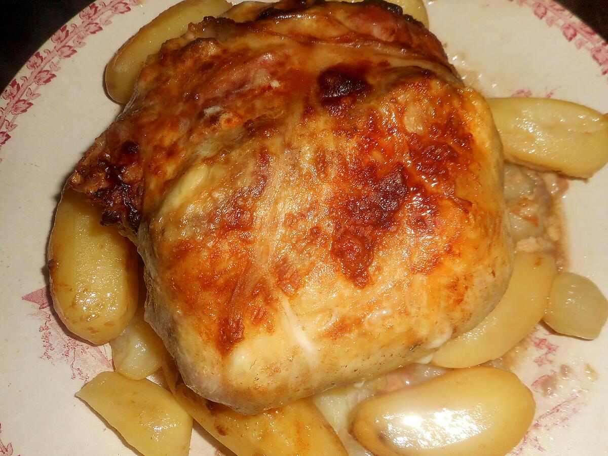 Un roti dans l échine de 850 gr environ8 tranches de moyennes épaisseur de jambon de savoie8 tranches de fromage à racletteune crepine assez grande pour envelopper le roti12 oignons sauciers8 pommes de terre10 cl de vin blanc sec( de savoie si possible)un bouquet garniune gousse d ailbeurrehuileselpoivre