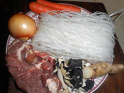 Mots-clés: ail, carotte, champignons noirs, coriandre, curcuma, échine de porc, gingembre, nouilles de riz, oignon, quatre épices