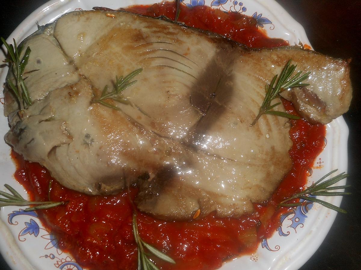 Une tranche de thon albacore de 380 gr environ2 oignons2 gousses d ailun piment vertune boite de pulpe de tomateune cac de sucre10 cl de vin blanchuile d oliveune dose d épices a paella2 branches de romarin ou de thymselpoivre