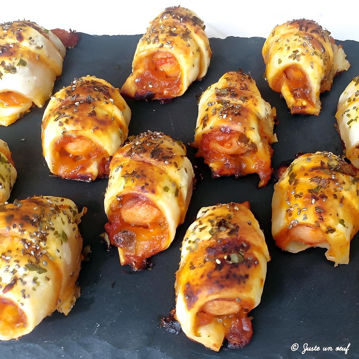 1 pâte feuilletée4 saucisses types KnackiKetchupMoutarde1 jaune d’œufBasilic séché
