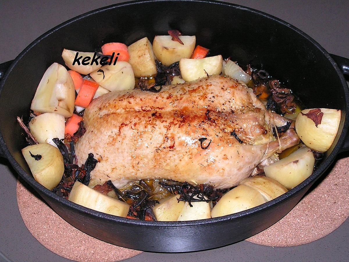 40 Mn avant la fin de la cuisson du canard ajouter les pommes de terre, lkes carottes, les oignons et les champignons dans la cocotte. Remuer les légumes et déglacer avec le cidre. Remettre au four sans le couvercle et continuer la cuisson.
