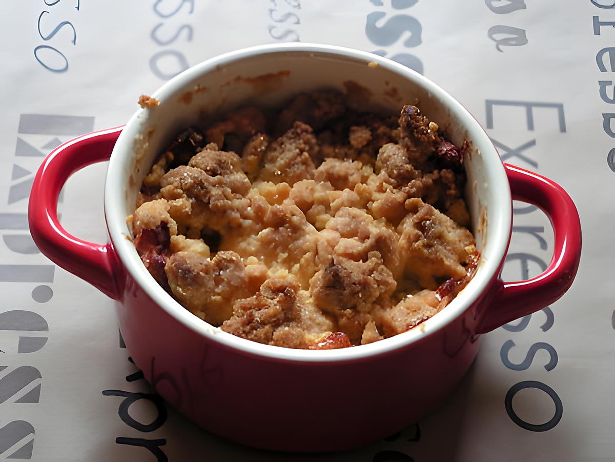 Beurrez vos minis-cocottes. Versez-y les fruits, saupoudrez du sucre restant et d’un peu de cannelle. Couvrez le tout du mélange de la terrine.